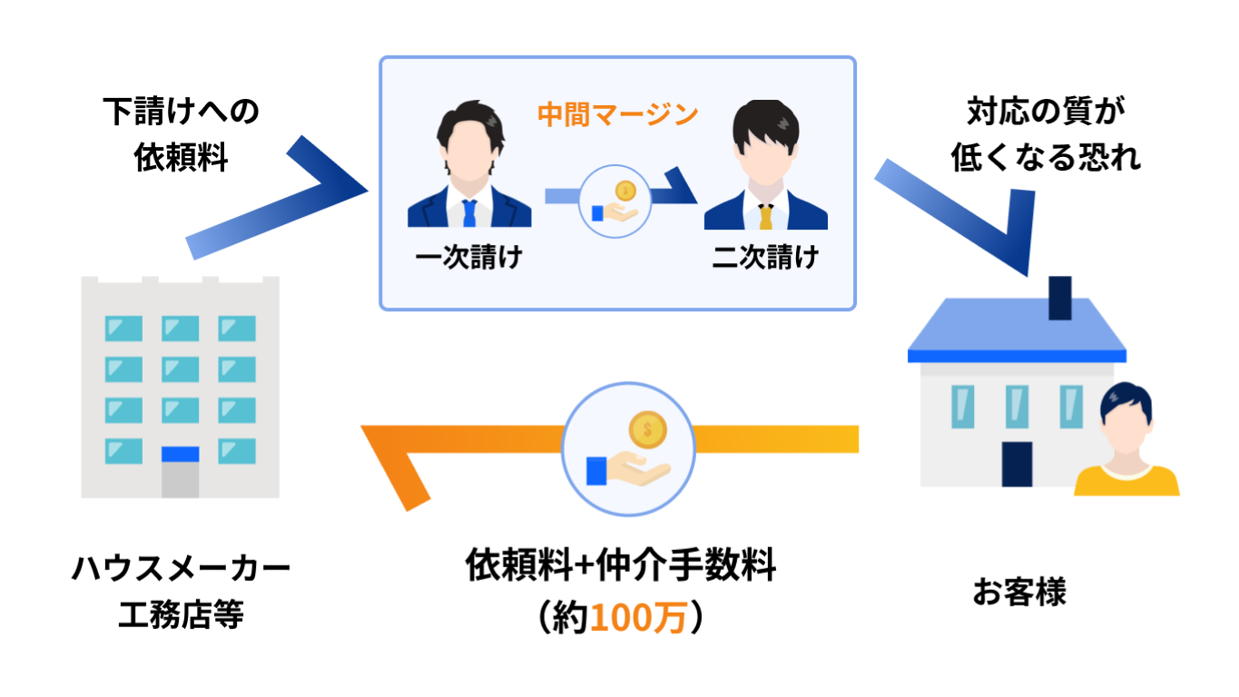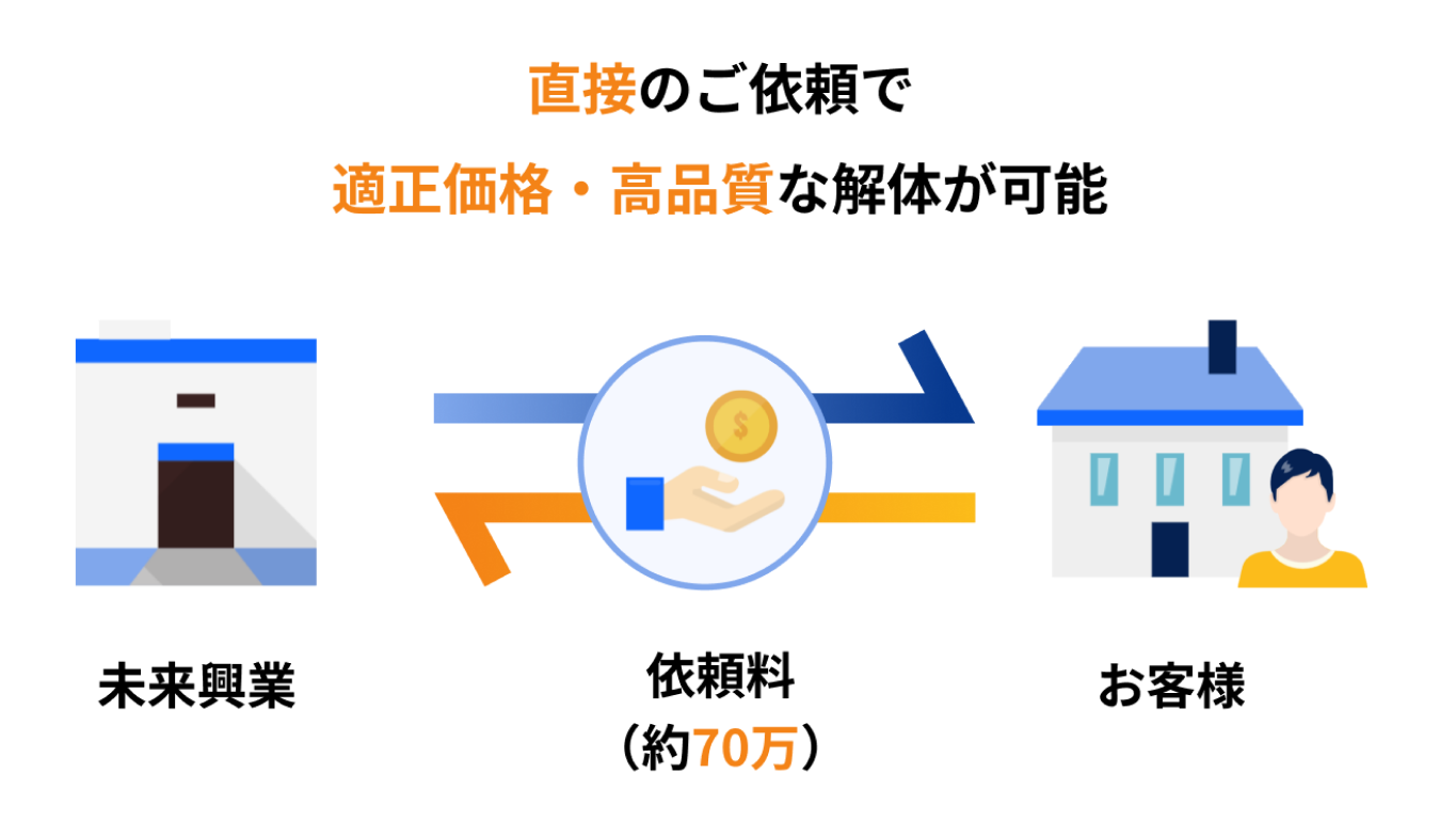 実は、多くの大手業者がウェブ広告や、テレビCM、新聞広告などで多額の広告宣伝費をかけておりその費用がお客様から頂く工事費に含まれていることをご存じでしょうか。未来興業では広告宣伝費を抑え、お客様から直接ご依頼をいただくことで可能な限りお安く、かつ高品質な施工をお届けすることができます!